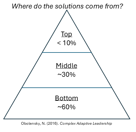 Research by Obolensky (2016) demonstrated that individual contributors provided ~60% of the best ideas and viable solutions to challenges in navigating changes in strategy, culture, and reorganization, whereas top-level managers provided less than 10% and middle level managers provided ~30%. This discrepancy leads to continued failure to address real issues and organizational decline as decision-making leaders become ever distant and cut off from the realities at the bottom.